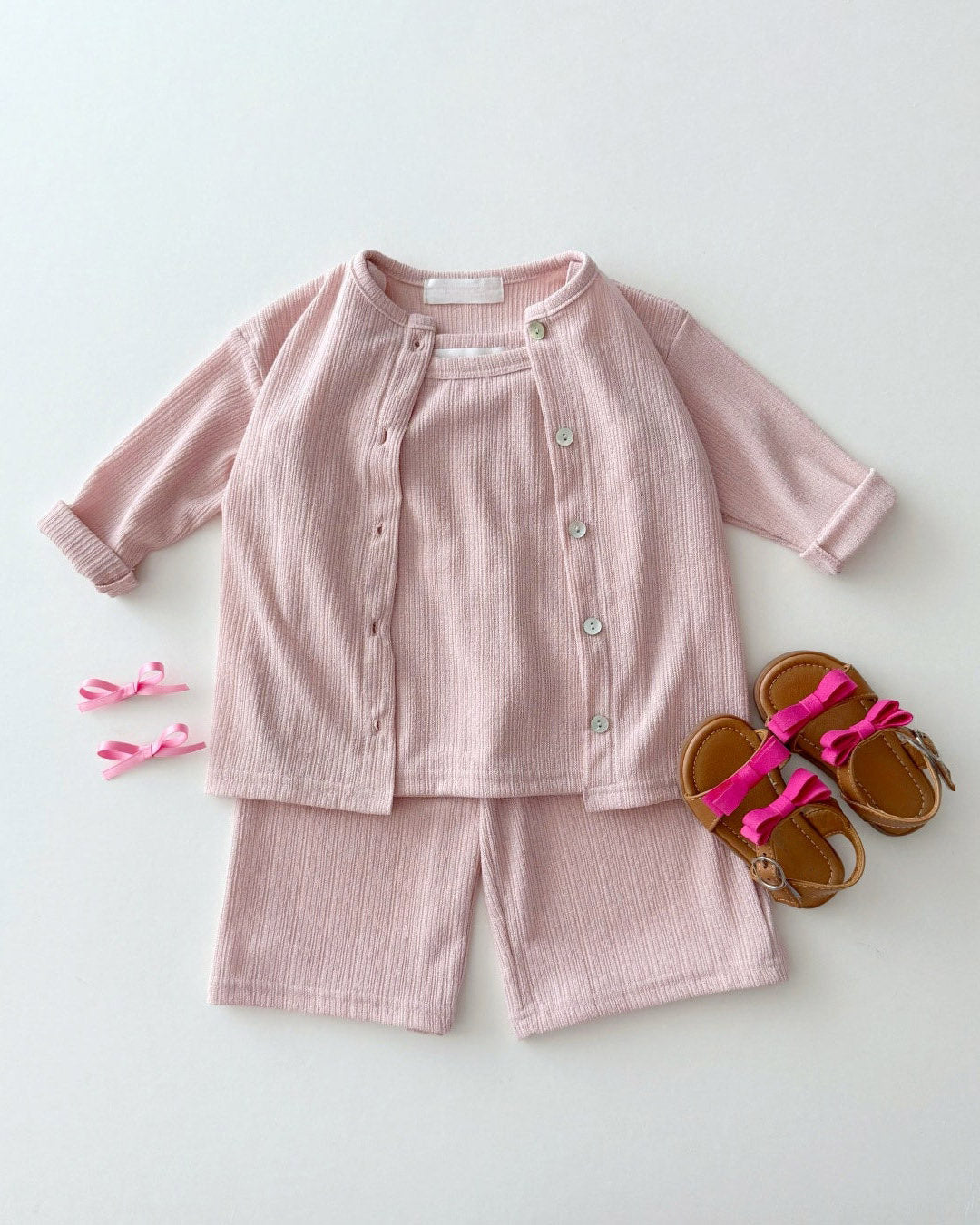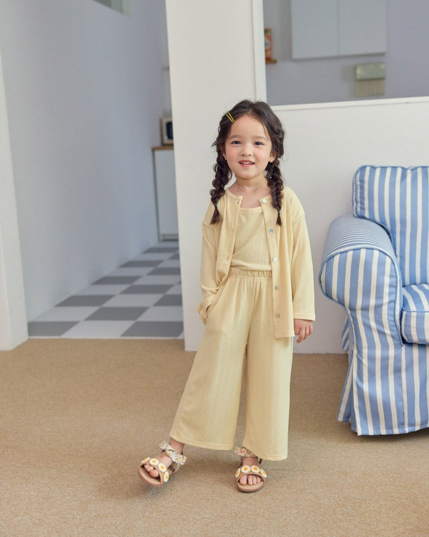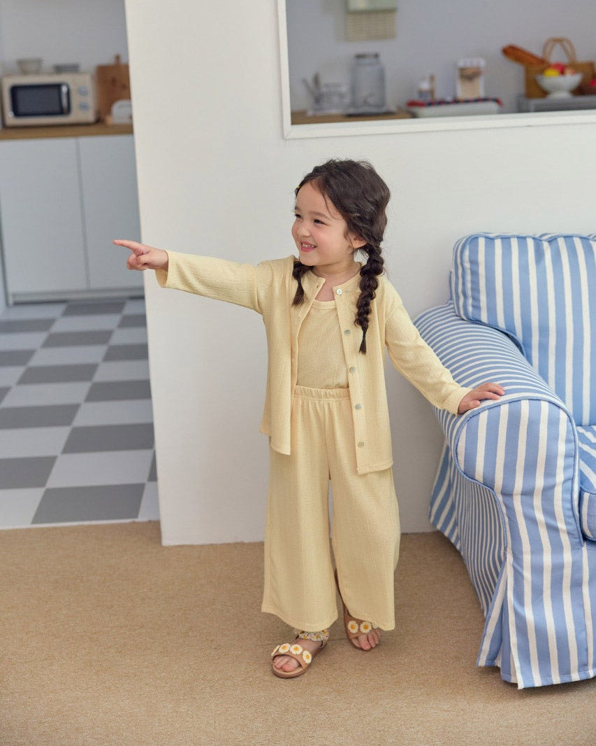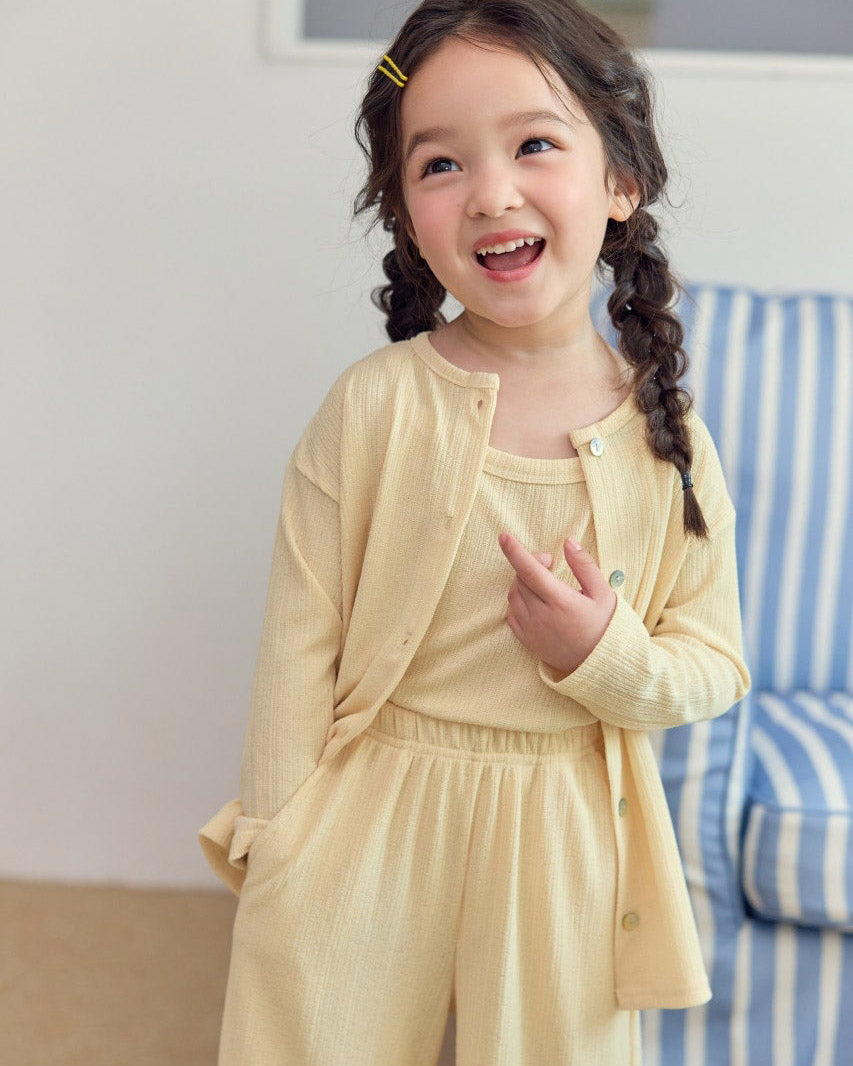 A whole outfit in one easy bundle. The Sunny Layers 3pc Set comes with a sleeveless tank, breezy wide-leg pants, and a lightweight cardigan — all made in a breathable crinkle rib knit for all-day comfort.