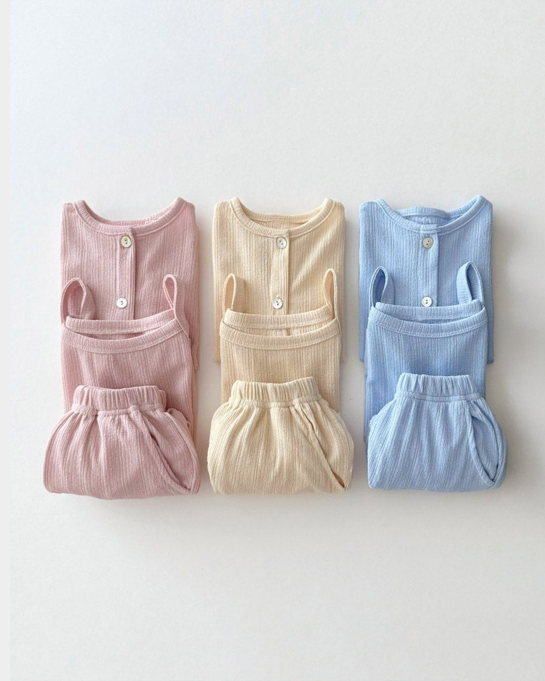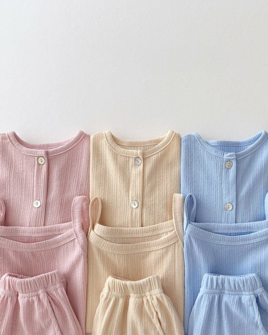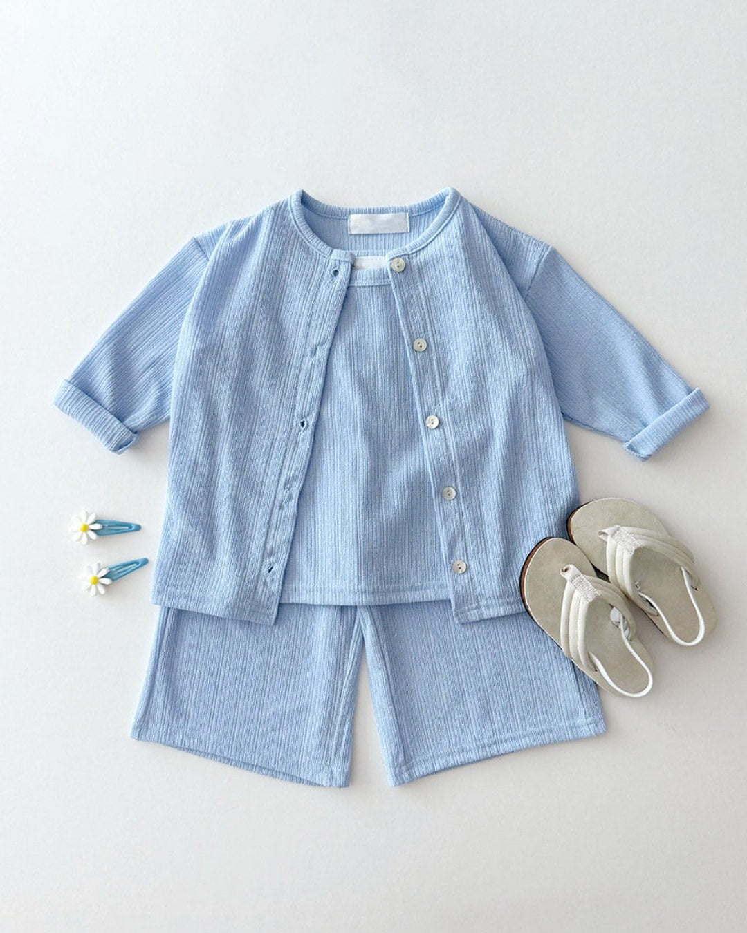 A whole outfit in one easy bundle. The Sunny Layers 3pc Set comes with a sleeveless tank, breezy wide-leg pants, and a lightweight cardigan — all made in a breathable crinkle rib knit for all-day comfort.