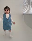 The Square Denim Dress is a versatile wardrobe staple for your little one. Made from soft, medium-wash denim with a structured yet relaxed silhouette, this dress is perfect for layering over tees, blouses, or knits. Classic details like the deep V-neckline, front button closure, and patch pockets add both function and charm. Easy to dress up or down, it’s an all-season favorite.